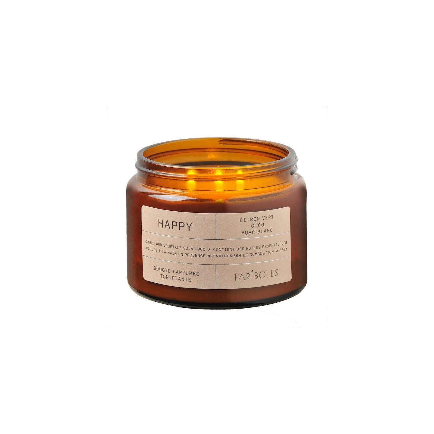 Bougie artisanale parfumée aux huiles essentielles, coulée à la main en Provence. Tonifiante - Parfum Happy : Citron vert / Coco / Musc blanc. Grand format : 400g avec 3 mèches. Environ 60h de combustion.
