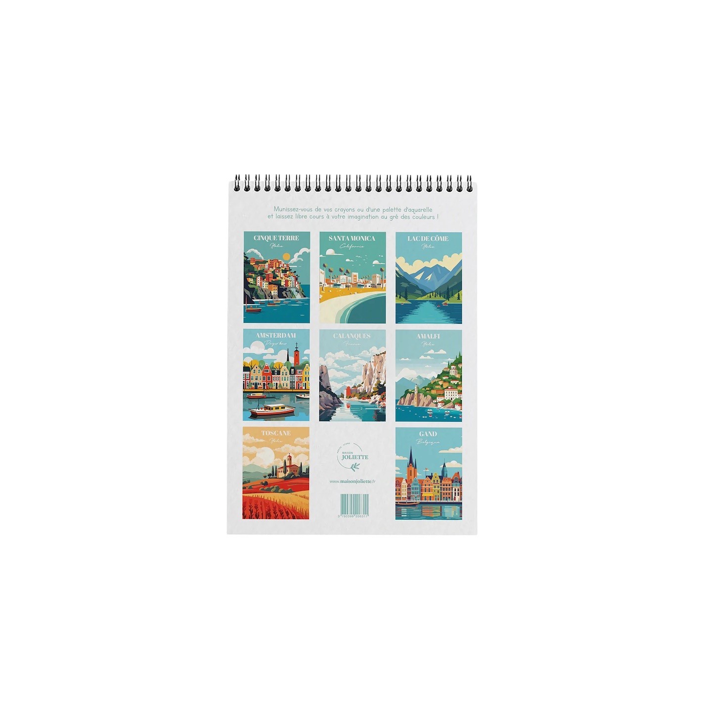 Carnet de coloriage "Voyage voyage" : 8 affiches A4 pré-illustrées à mettre en couleur, mettant en avant chacune un paysage et/ou une architecture typiques (ex : Les calanques, Amsterdam, le lac de Côme ou encore la Toscane, etc) . Muni de vos crayons, vos feutres ou bien votre matériel de peinture (aquarelle, gouache, acrylique...), laissez-vous inspirer et votre esprit s'évader. Papier de qualité 300 g/m2 texturé : pour un beau rendu. Dimensions totales : 21 x 29,7 cm, format portrait.