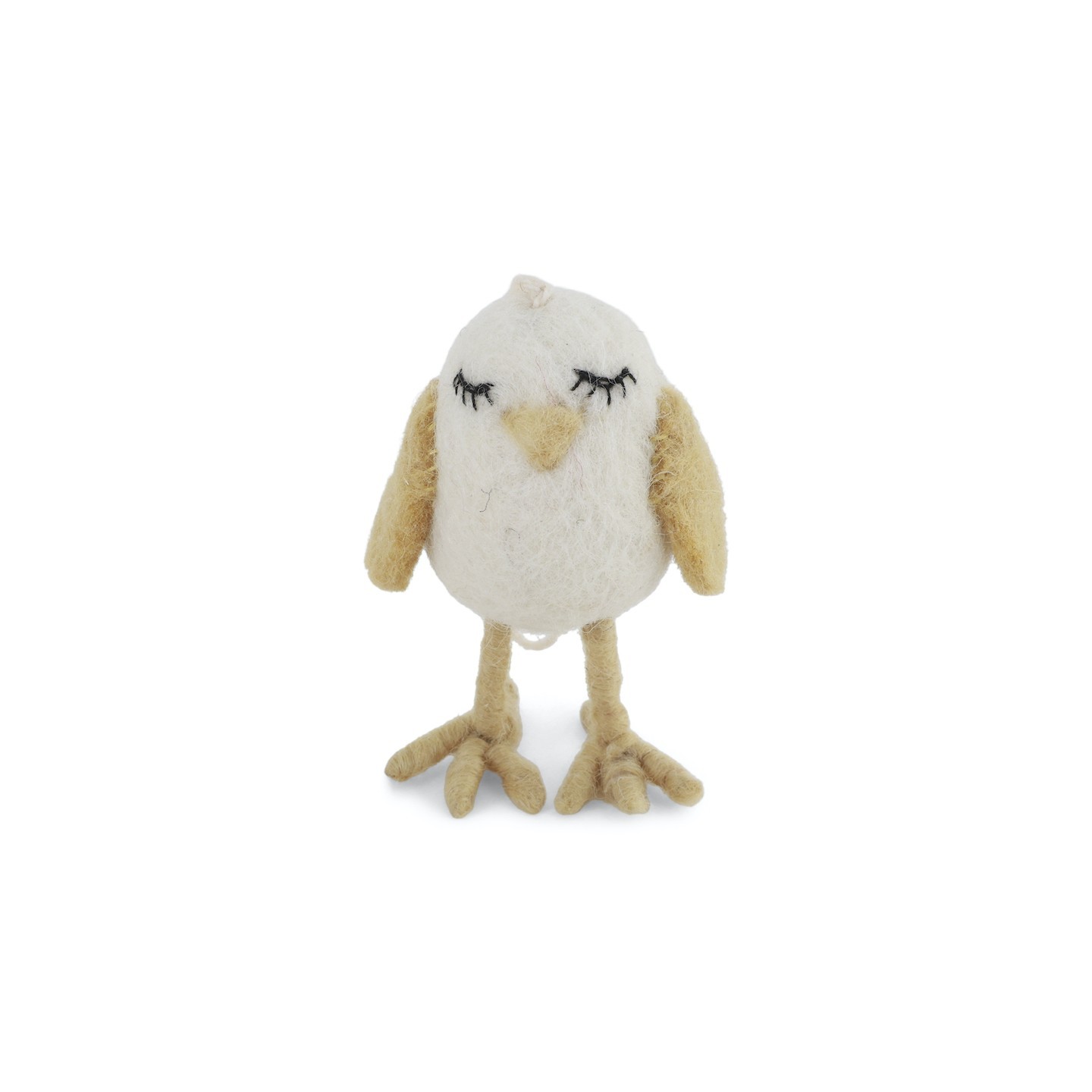 Poussin rêveur en laine, blanc avec ses ailes jaunes pâles, de chez Gry & Sif. Avec un petit fil, il peut être suspendu ou tenir debout. 100% pure laine naturelle de Nouvelle Zélande, fait à la main au Népal. Hauteur 7 cm.