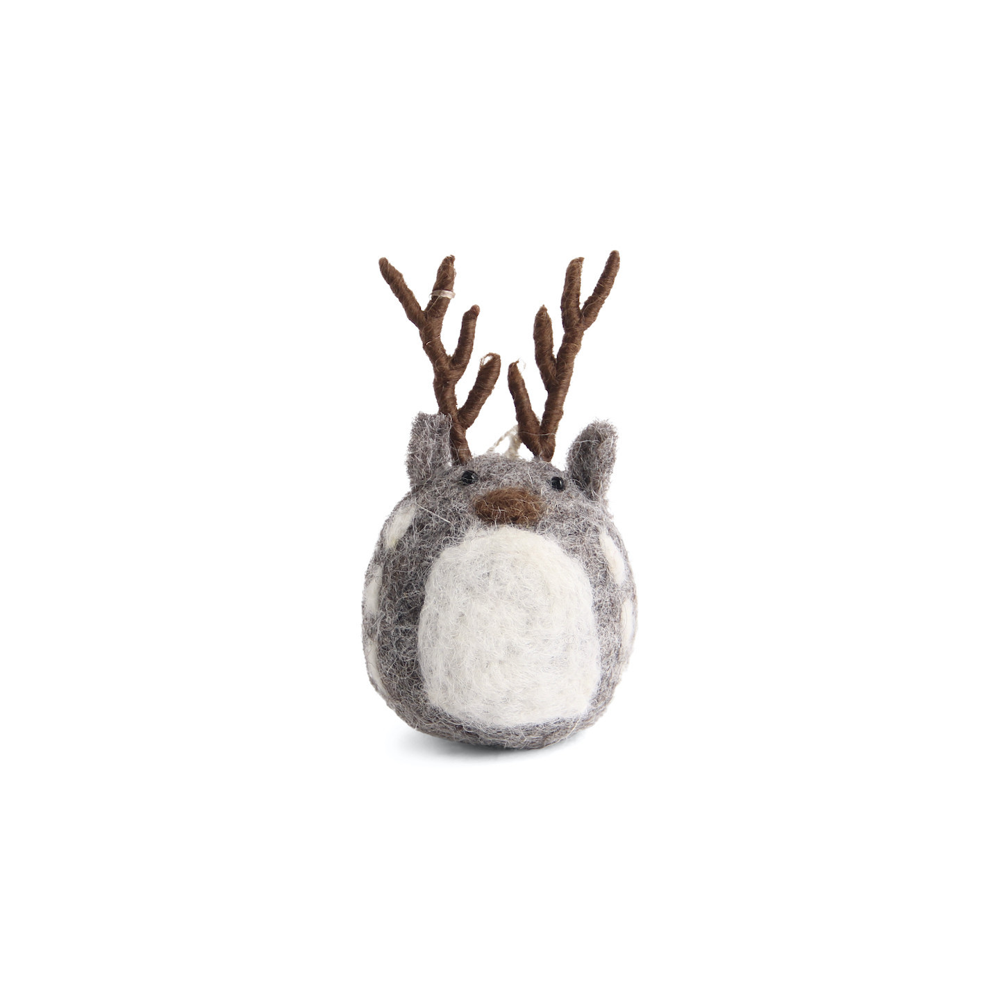 Petit renne gris en laine Gry & Sif, tout rond, tout mignon avec ses beaux bois dressés. Avec un petit fil, peut être suspendu comme décoration pour Noël, dans le sapin ou tout autre endroit qu'il pourra agrémenter ! 100% pure laine naturelle de Nouvelle Zélande, fait à la main au Népal. Hauteur : 10 cm.