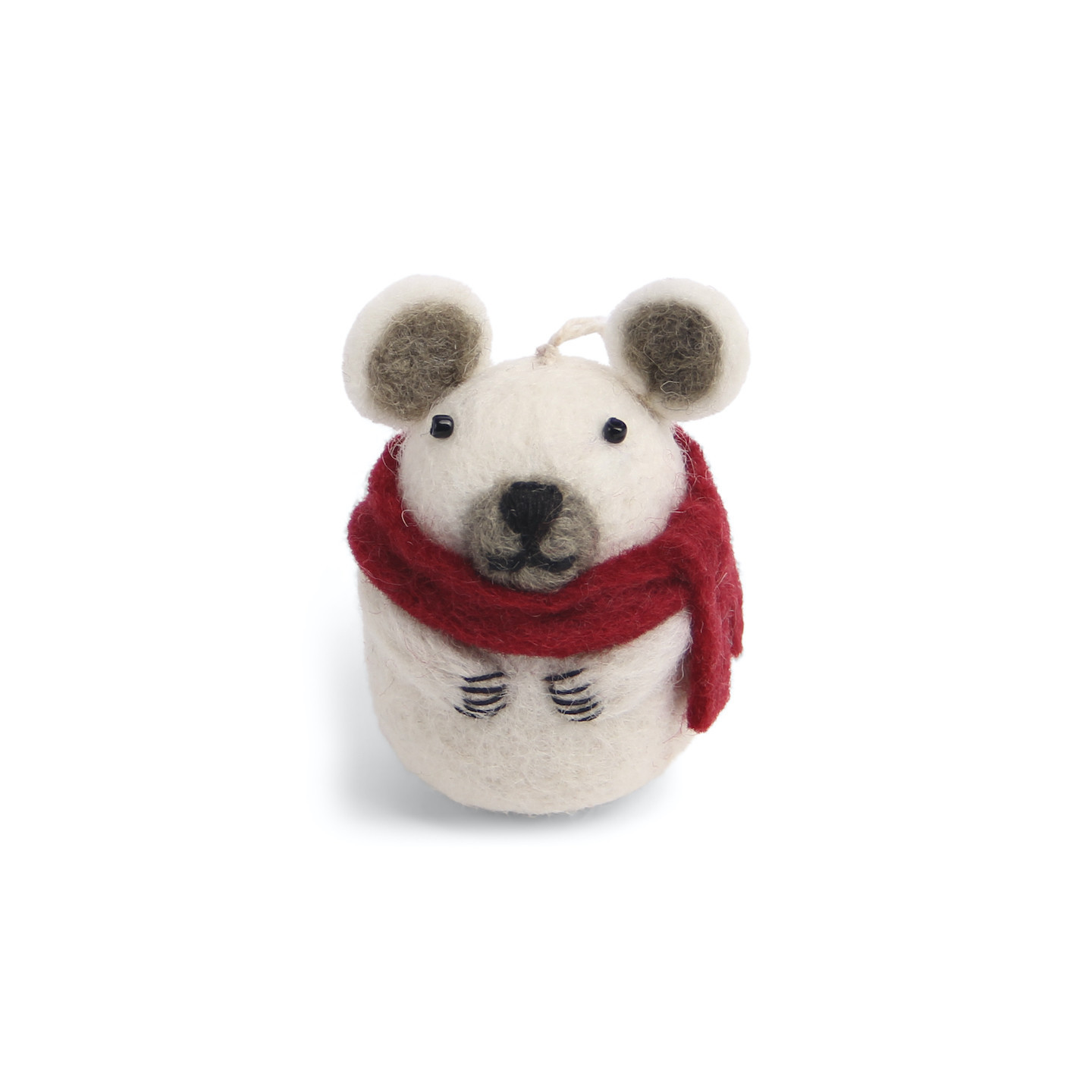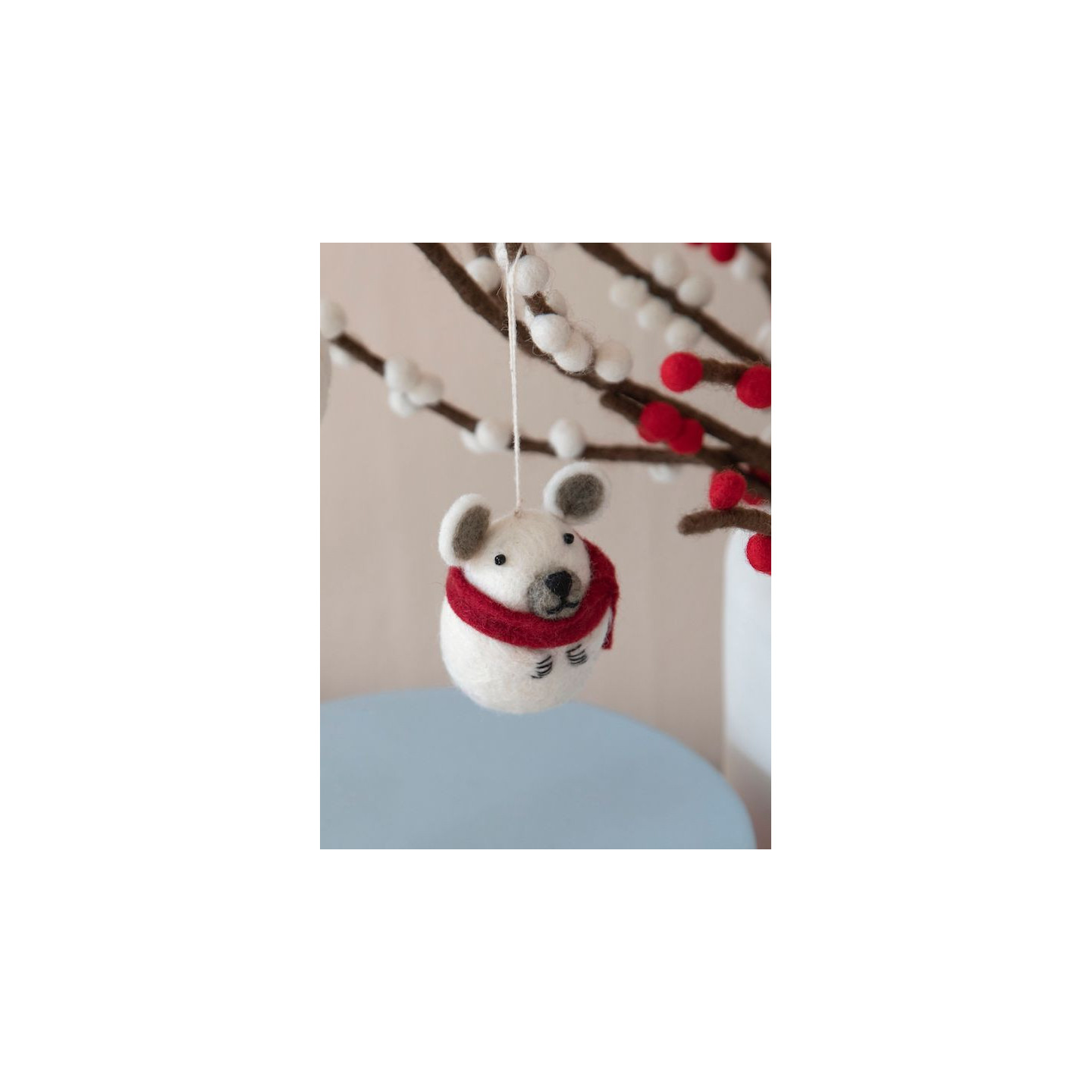 Petit ours polaire en laine Gry & Sif, tout rond, tout mignon avec son écharpe rouge. Avec un petit fil, peut être suspendu comme décoration pour Noël, dans le sapin ou tout autre endroit qu'il pourra agrémenter ! 100% pure laine naturelle de Nouvelle Zélande, fait à la main au Népal. Hauteur : 7 cm.