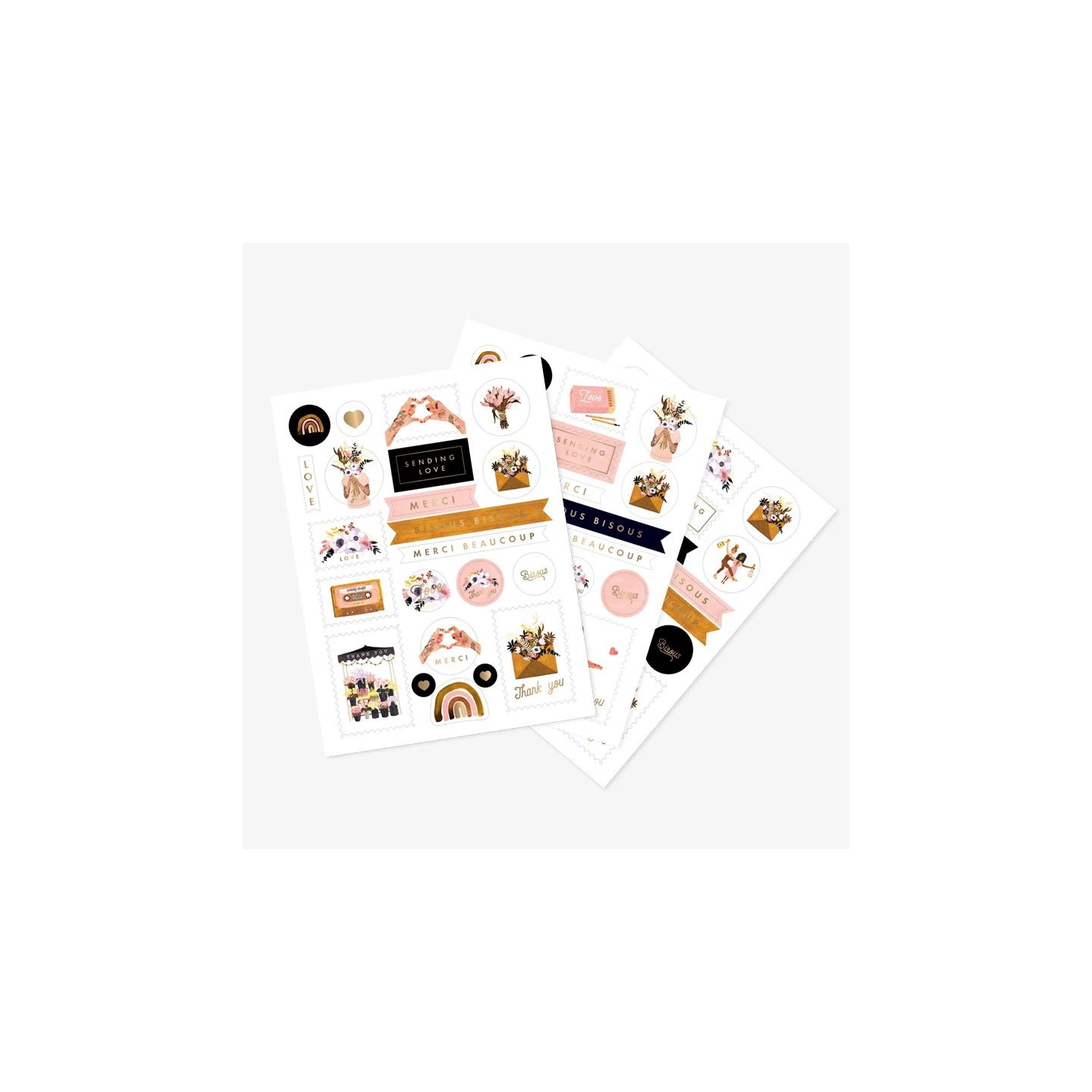 3 planches de stickers sur le thème "Love & Thank you" : élégants, délicats, chaleureux... illustrations ou textes... 3 planches, 66 stickers au total. Dimension d'une planche : 20 x 15 cm.