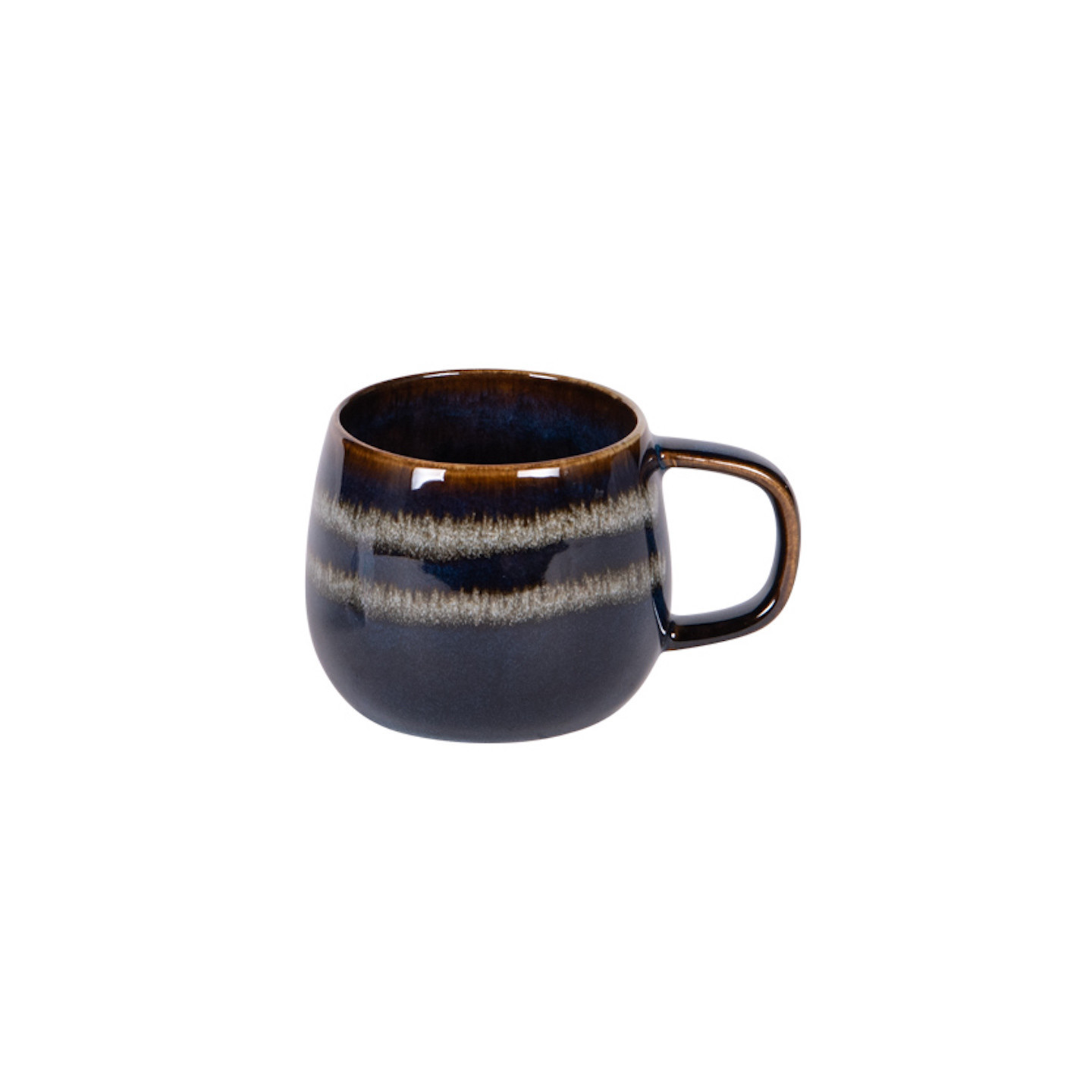 Mug en grès émaillé d'un beau coloris profond Bleu nuit, avec deux bandes claires qui lui apportent une petite touche de fantaisie. Sa forme généreuse en fait un mug parfait pour une boisson réconfortante en hiver... Existe en d'autres coloris avec d'autres motifs.