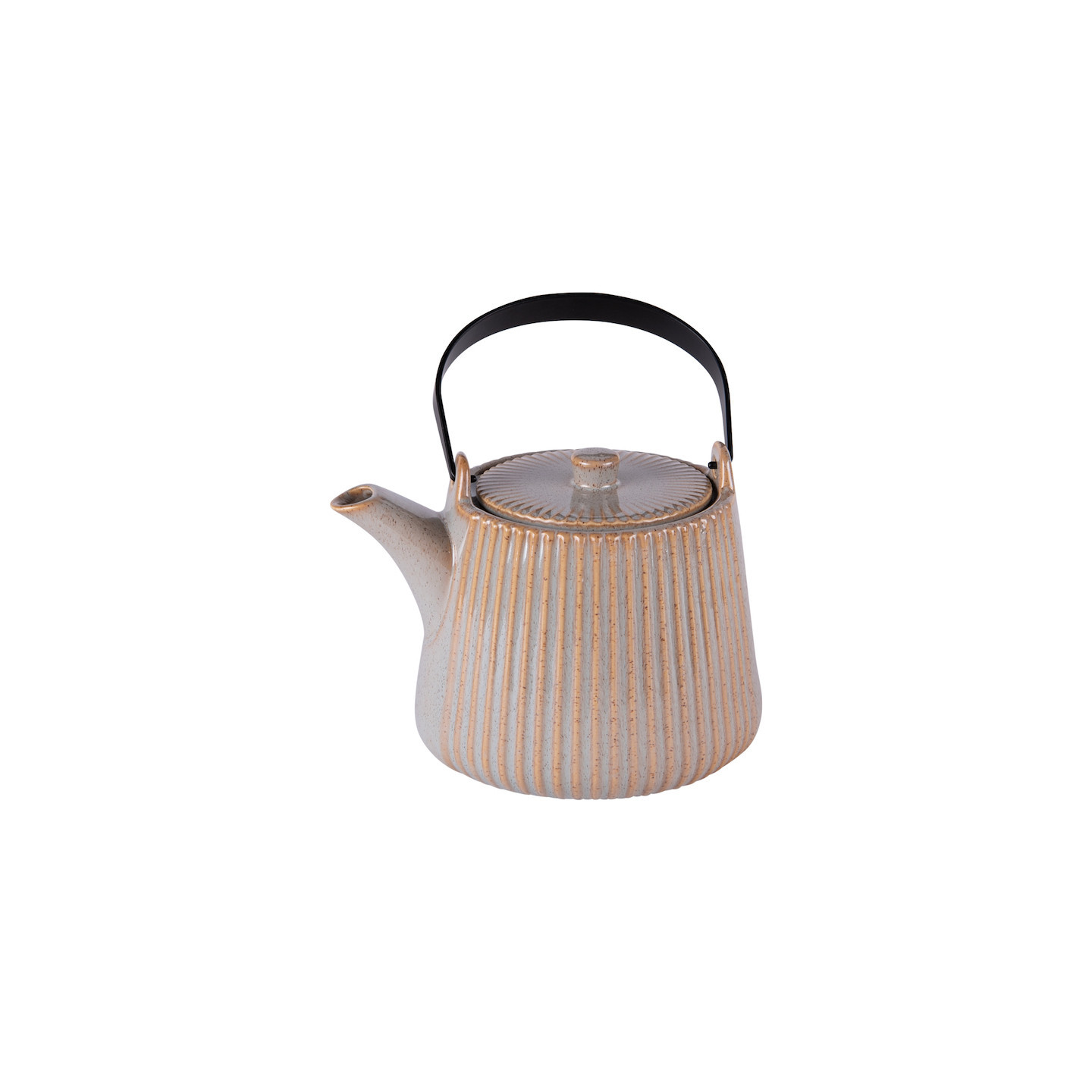 Corps et couvercle en grès, filtre en inox et anse en métal noir.